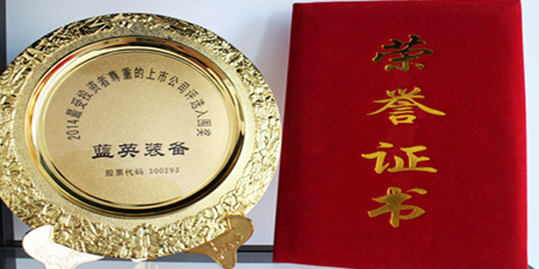 2015年2月,藍英裝備(股票代碼:300293)參加由中國上市公司協(xié)會(huì )、中國證券投資者保護基金公司主辦,中國證券業(yè)協(xié)會(huì )、中國證券投資基金業(yè)協(xié)會(huì )協(xié)辦的2014年度最受投資者尊重的上市公司評選活動(dòng),最終藍英裝備獲得2014年度最受投資者尊重的上市公司評選入圍獎。